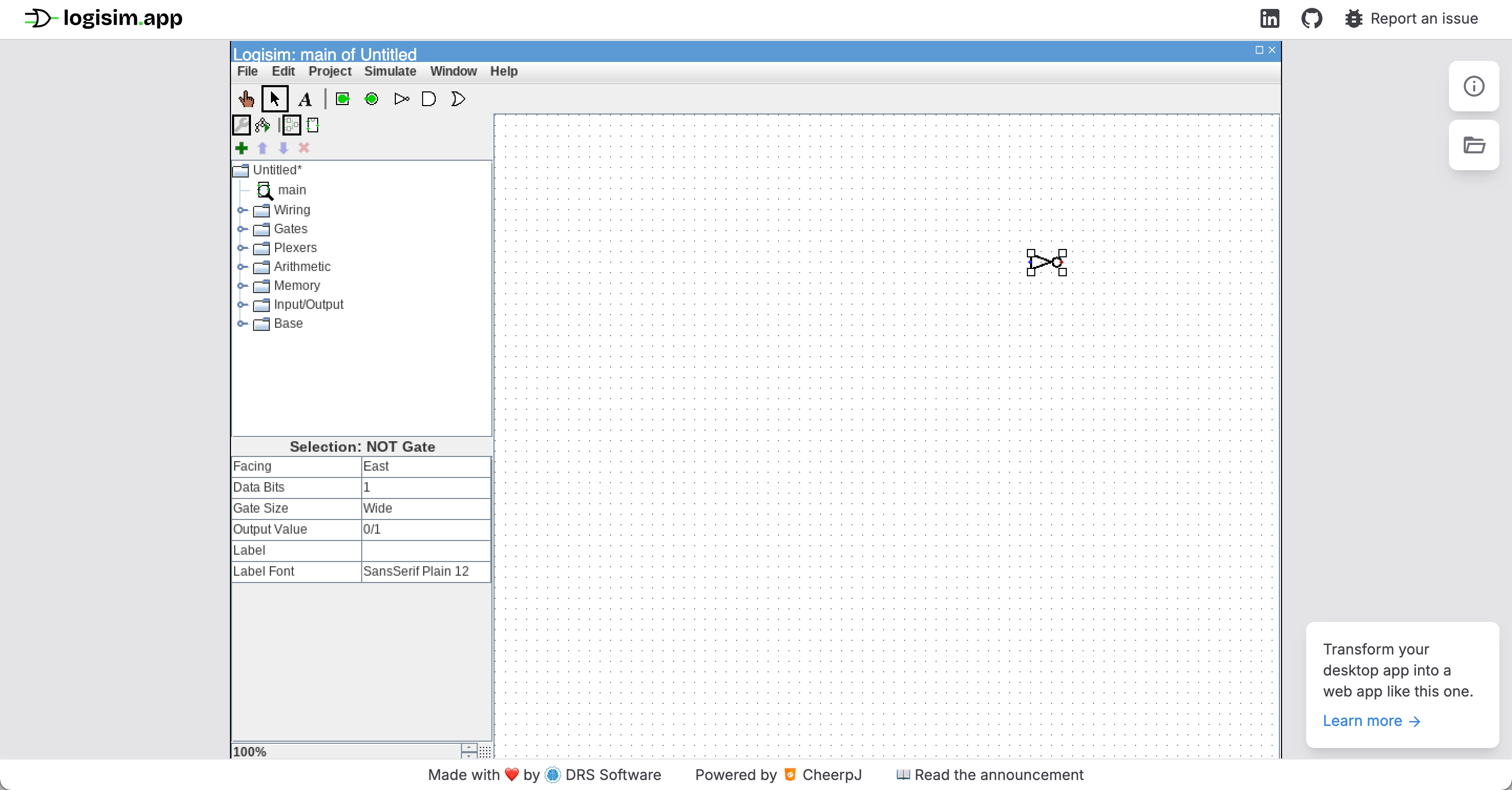 Logisim.app is a 1:1 port that works by running Java on a WebAssembly JVM via CheerpJ. The Java codebase is the same as the original, with a few targeted modifications to allow Logisim to work within the browser’s secure sandbox — including letting users open and save files to disk.